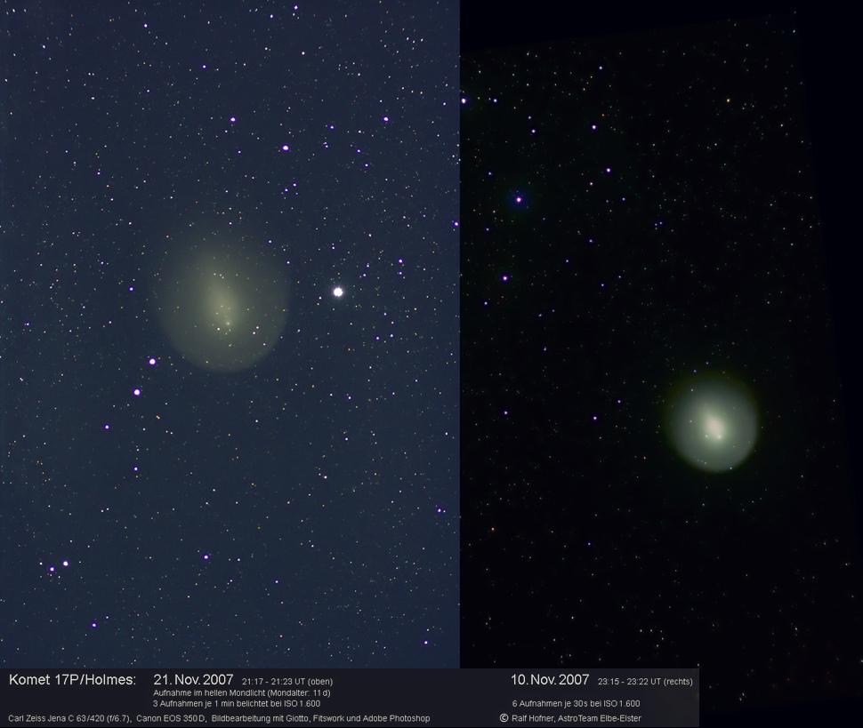 17P / Holmes: Größenentwicklung + Bewegungsstrecke am Sternhimmel