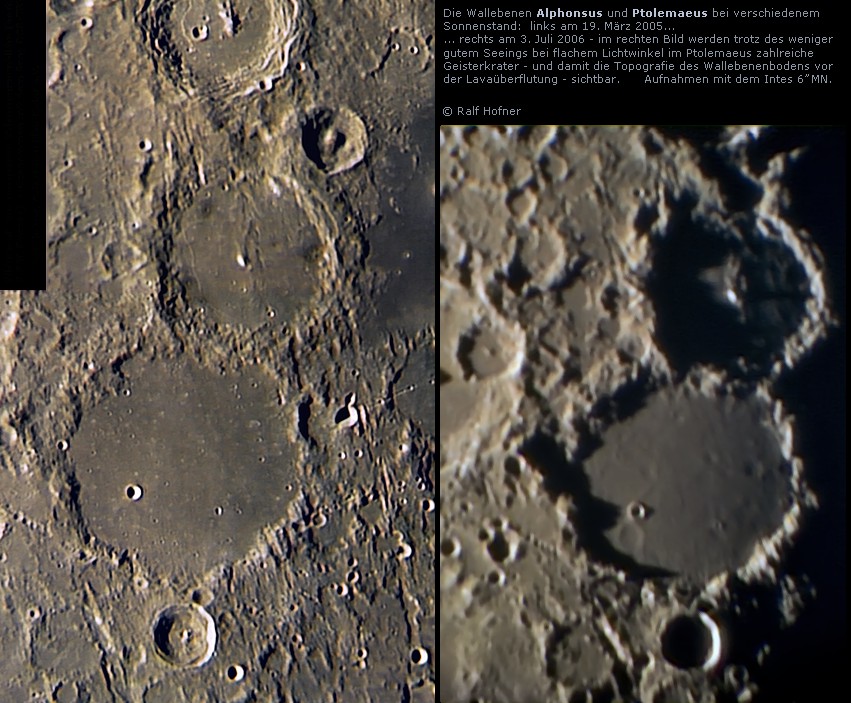 Ergänzend zu den Erläuterungen oben im Bild sei angemerkt, dass die eindrucksvollen Geisterkrater sowie auch die bizarren Schattenwürfe im Inneren von Ptolemeaus (rechte Aufnahme) zeigen, dass sich auch bei ungünstigerem Seeing mal ein Blick zum Mond lohnt, zumal ganz bestimmte Terminatorverläufe ja nicht jeden Monat eintreten...