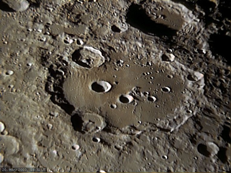 Man beachte auch auch die zahllosen Kleinkrater und anderen Details im Inneren dieser alten Mondstruktur.