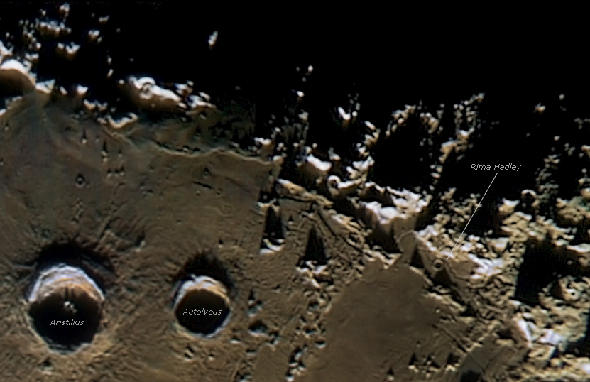 norden ist links - Entzerrte Darstellung wie im vorhergehenden Bild... Sehr interessant sind die Rillensysteme im Vorland des mächtigen, bis zu 6.ooo m hohen Kettengebirges der Mond-Apenninen, z.B. in der Region des Kraters Hadley - sowie die Schattenwürfe der westlich (im Bild unter- halb) vorgelagerten Bergkette... - Aufnahmetechnik: Intes 6"Maksutov-Newton + Sony DCR-TRV30E (Summenbild von über 3.ooo Frames).