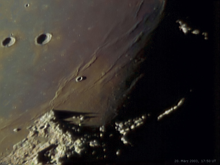 Aufnahme der berühmten Regenbogenbucht SINUS IRIDUM - in dieser Beleuchtungsphase auch "Goldener Henkel" des Mondes genannt: der Terminator verläuft hier direkt durch diese sehr imposante Oberflächenformation. Es ist ein früherer Großkrater Ø 260 km, dessen Südwall mit der Entstehung des Mare Imbriums eingeschmolzen wurde - sein nun östlichster Vorsrung (Kap Laplace) wirft im Bild einen prägnanten Schatten in den farbig abwechslungs- reich gestalteten Boden jener Mare-Region. Die ersten Sonnenstrahlen erreichen gerade auch das gegenüberliegende Kap Heraclides, südlich von diesem landete übrigens die Raumsonde LUNA 17, die das automatische Mondmobil → Lunochod 1 absetzte. - Die Aufnahme entstand bei mäßig gutem Seeing in Falkenberg (Elster) mit: Intes 6"-Maksutov-Newton + Sony DCR-TRV30. Im Bild ist Norden unten.