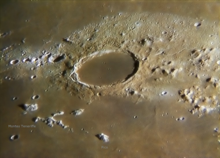 Bei starker Farbsättigung wie hier wird das unterschiedliche Alter bestimmter Formationen deutlich: junge, helle Einschlagskrater stehen links vom Plato - beeindruckend ist auch die Helligkeit der "Mond-Kanaren", die irdischen vor der Nordwestküste Afrikas sind ja bekanntlich geologisch dunkle Vulkaninseln, MONTES TENERIFFE auf dem Mond dagegen besticht durch sein helles Gestein inmitten der dunklen Lava-Umgebung des MARE IMBRIUM.
