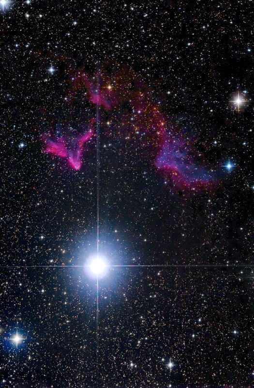 Der recht helle, bläuliche Stern im Bild ist Gamma Cassiopeiae.