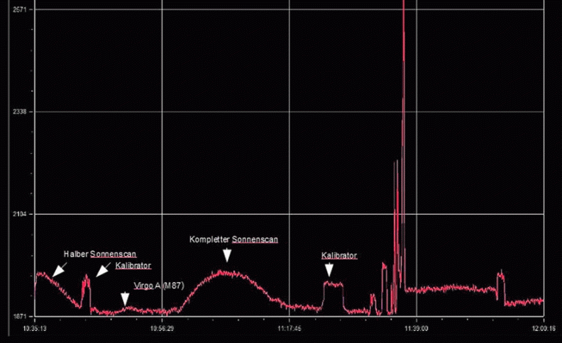 Auf der ersten Messung (das Diagramm auf dieser Seite - RH.) sieht man zuerst die Geostationären Fernsehsatelliten als Kalibratoren. Wenn man die Strahlungsleistung der Satelliten kennt, sind sie ideale Kalibratoren. Dann Cold Sky, d.h der kalte Quellenfreie Himmel. Das Signal setzt sich aus der 3K Hintergrundstrahlung, dem Strahlungsbeitrag unaufgelöster Radioquellen, dem Beitrag der Atmosphäre, der Antenne und der Rauschleistung des Empfangssytems zusammen.