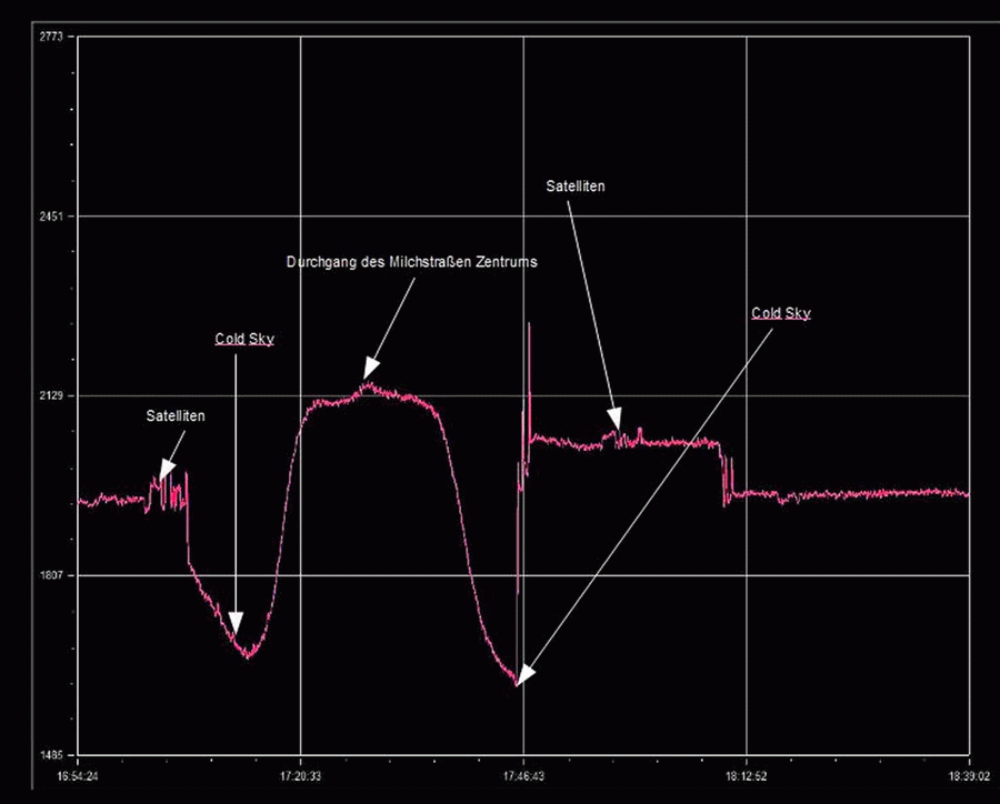 Dann folgt der Durchgang des Michlstraßenzentrums, dann wieder Cold Sky und wieder die Satelliten. Für kleine Antennen ist die Milchstraße nach der Sonne die stärkste Natürliche Quelle am Himmel.