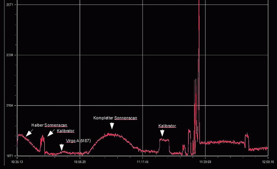 Im Bild dieser Messung sieht man zuerst einen halben Scan der Sonne. Danach Andreas' Auto als Kalibrator. Dabei kann man aus der mit dem Thermo- meter gemessen Temperatur und dem in willkürlichen Einheiten der Auswertesoftware gemessenen Signalanstieg die physikalischen Größen des Empfangssystem ermitteln. Vor dem nächsten Sonnendurchgang sieht man bei zwischen 10:49 und 10:53 Uhr einen kleinen "Buckel". das ist höchstwahr- scheinlich Virgo A oder M87, die zentrale Elliptische Galaxie, welche im Virgo-Galaxienhaufen die eine starke Radioquelle ist.